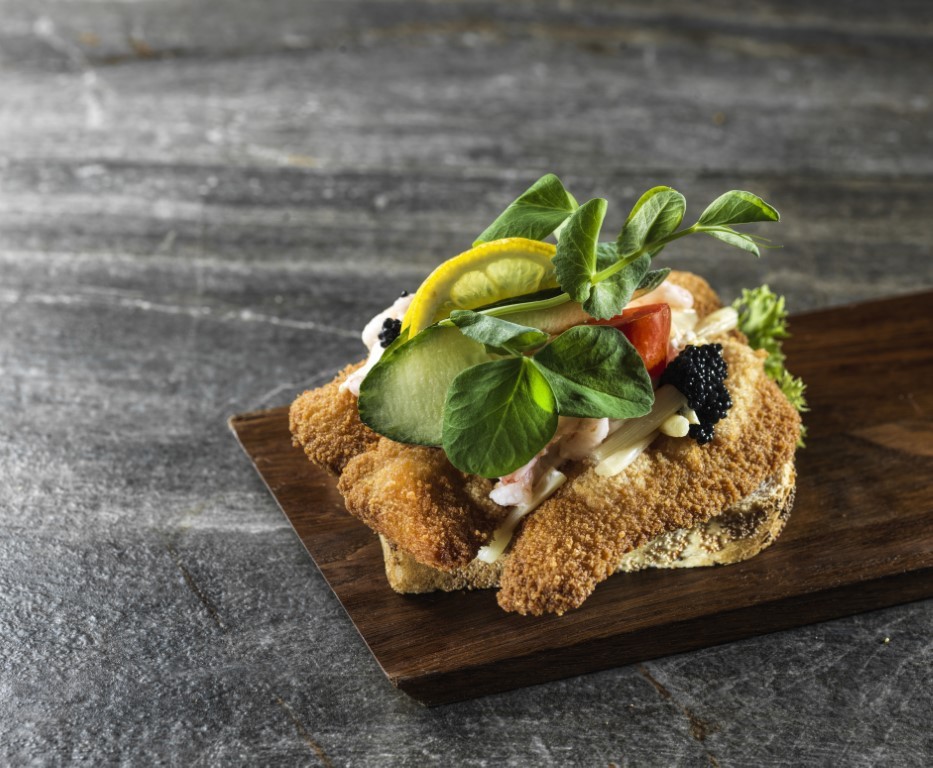 2 stegte rødspættefilet, stjerneskudsdressing, rejer, asparges og pynt
